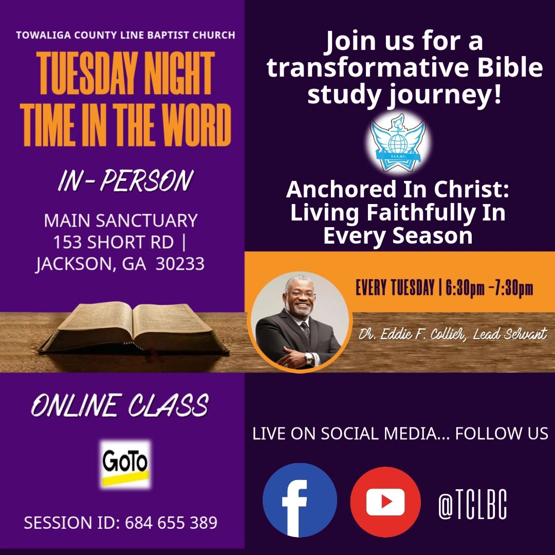 Tuesday Night Time In The Word is being held in person & online every Tuesday at 6:30 pm. Members attending online via GoTo will need to join by using Member ID: 684 655 389 and if attending via phone need to dial the following: Dial in number (646) 749-3122 Access Code: 684-655-389 ##