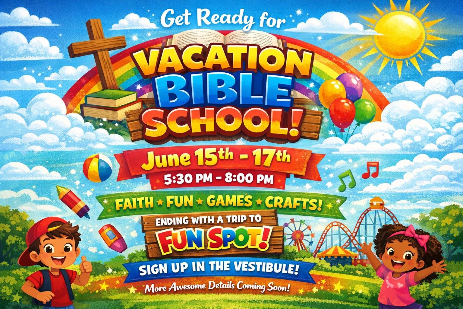 VBS will end with an outing to Fun Spot in Fayetteville, GA. The church vans will be available and will leave the church at 8:30AM for the park opens at 10AM. Lunch will be provided.